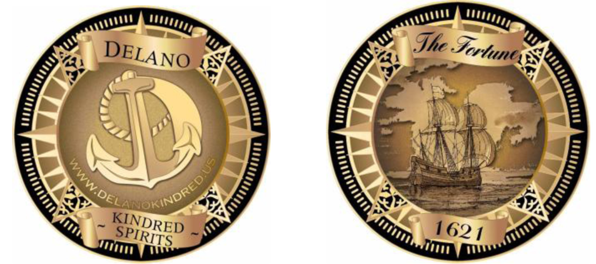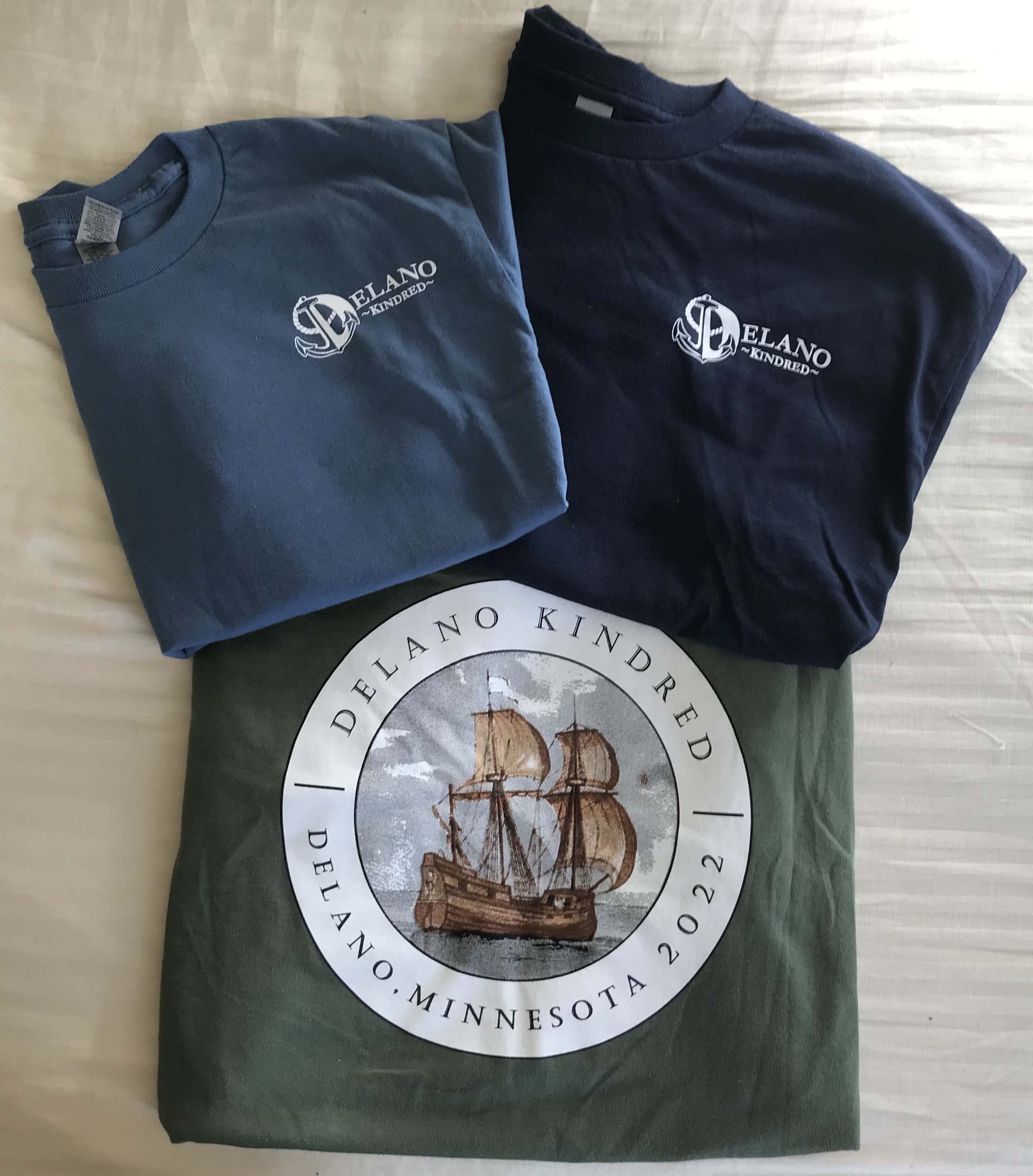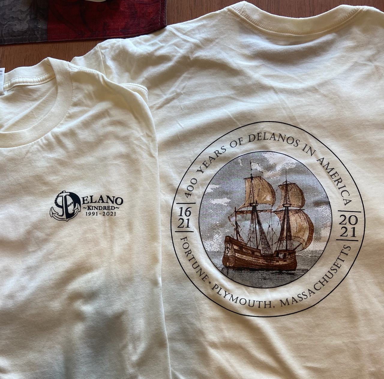 These lightweight T-Shirts mark the 400th anniversary of Philip Delano arriving in America in 1621 and the 30th anniversary of the founding of the Delano Kindred in 1991. They are 100% cotton with the Delano Kindred Anchor Logo and 1991-2021 over the chest area on the front and the ship Fortune, drawn by Dr. Jeremy D. Bangs, in a circle on the back with "400 YEARS OF DELANOS IN AMERICA" and "FORTUNE ~ PLYMOUTH MASSACHUSETTS" on the back.